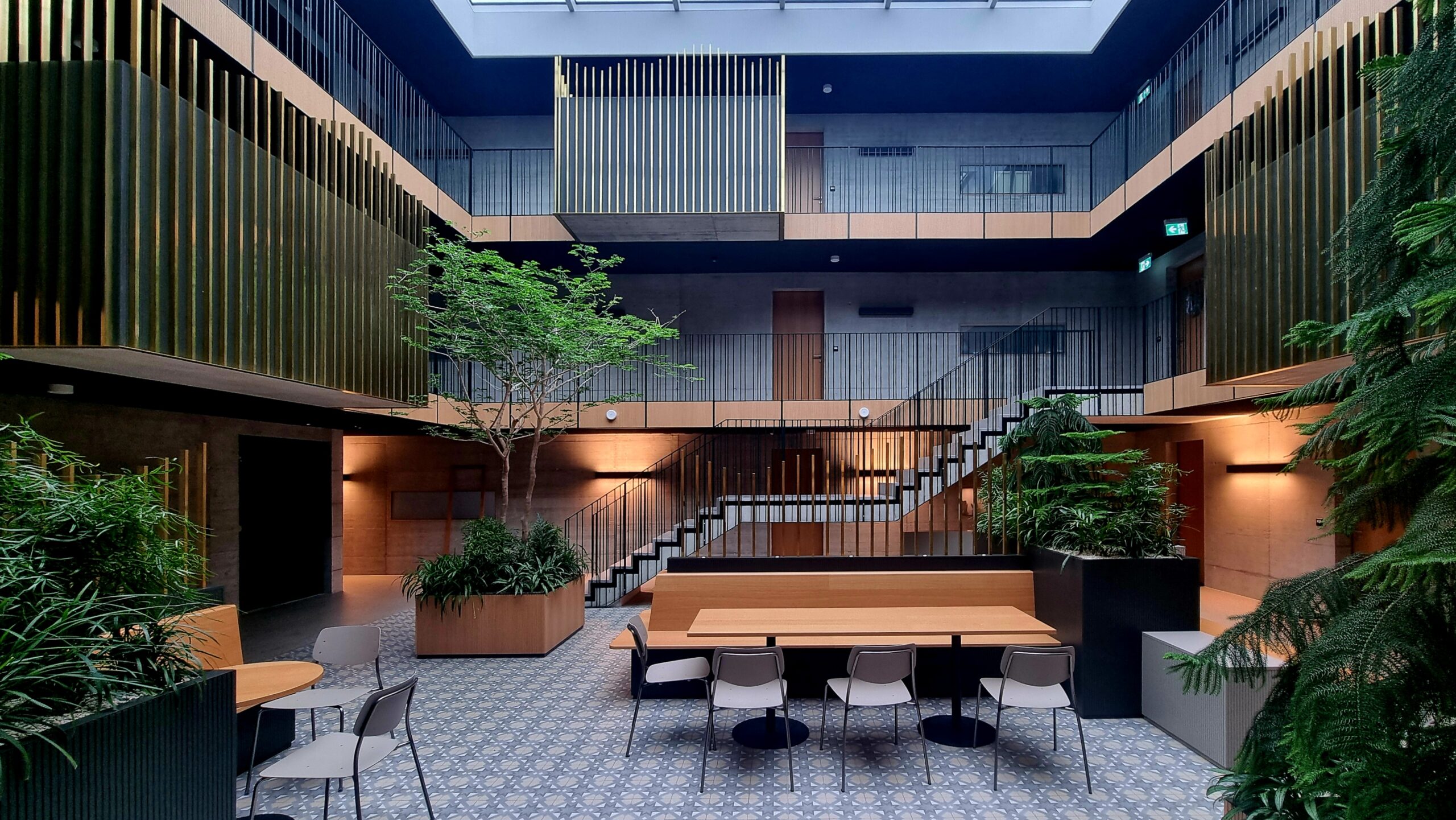 Das Hofhaus mit seinem eindrucksvollen, lebendigen Atrium wirkt als schützender Riegel gegenüber den Lärmemissionen des angrenzenden Bahnhofs. Die Architektur der gesamten Überbauung verbindet moderne Gestaltung mit traditionellen Elementen. Durch diese sorgfältige Interpretation von Proportionen, Materialien und Farben fügt sie sich insgesamt harmonisch und unaufdringlich in das Deitinger Dorfbild ein.